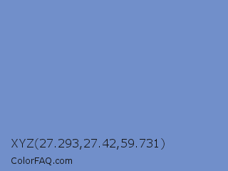 XYZ 27.293,27.42,59.731 Color is a light blue color and the nearest color is Cerulean Frost #6d9bc3. Hex code #718fca and RGB value is rgb(113,143,202). In RGB color space, this color is composed of 44% red, 56% green, 79% blue, In CMYK color space, this color is composed of 44% cyan, 29% magenta, 0% yellow , 21% black , In HSL color space, this color has a hue angle of 220° , 46% saturation and 62% lightness.