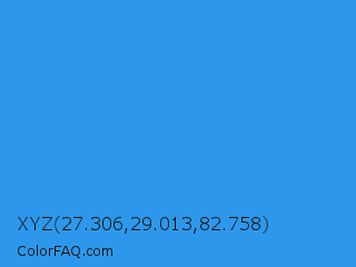 XYZ 27.306,29.013,82.758 Color is a normal blue color and the nearest color is Button Blue #24a0ed. Hex code #2d98eb and RGB value is rgb(45,152,235). In RGB color space, this color is composed of 18% red, 60% green, 92% blue, In CMYK color space, this color is composed of 81% cyan, 35% magenta, 0% yellow , 8% black , In HSL color space, this color has a hue angle of 206° , 83% saturation and 55% lightness.