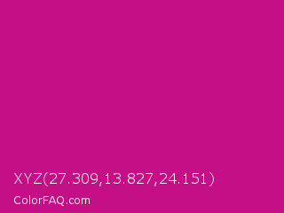 XYZ 27.309,13.827,24.151 Color is a normal magenta color and the nearest color is Red Violet #c71585. Hex code #c40f87 and RGB value is rgb(196,15,135). In RGB color space, this color is composed of 77% red, 6% green, 53% blue, In CMYK color space, this color is composed of 0% cyan, 92% magenta, 31% yellow , 23% black , In HSL color space, this color has a hue angle of 320° , 86% saturation and 41% lightness.