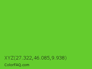 XYZ 27.322,46.085,9.938 Color is a normal green color and the nearest color is Green RYB #66b032. Hex code #64cc2d and RGB value is rgb(100,204,45). In RGB color space, this color is composed of 39% red, 80% green, 18% blue, In CMYK color space, this color is composed of 51% cyan, 0% magenta, 78% yellow , 20% black , In HSL color space, this color has a hue angle of 99° , 64% saturation and 49% lightness.