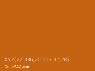 XYZ 27.336,20.703,3.128 Color is a normal orange color and the nearest color is Alloy Orange #c46210. Hex code #c46312 and RGB value is rgb(196,99,18). In RGB color space, this color is composed of 77% red, 39% green, 7% blue, In CMYK color space, this color is composed of 0% cyan, 49% magenta, 91% yellow , 23% black , In HSL color space, this color has a hue angle of 27° , 83% saturation and 42% lightness.