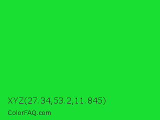 XYZ 27.34,53.2,11.845 Color is a normal green color and the nearest color is Vivid Malachite #00cc33. Hex code #18df32 and RGB value is rgb(24,223,50). In RGB color space, this color is composed of 9% red, 87% green, 20% blue, In CMYK color space, this color is composed of 89% cyan, 0% magenta, 78% yellow , 13% black , In HSL color space, this color has a hue angle of 128° , 81% saturation and 48% lightness.