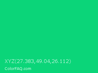 XYZ 27.383,49.04,26.112 Color is a normal green color and the nearest color is Caribbean Green #00cc99. Hex code #0bd579 and RGB value is rgb(11,213,121). In RGB color space, this color is composed of 4% red, 84% green, 47% blue, In CMYK color space, this color is composed of 95% cyan, 0% magenta, 43% yellow , 16% black , In HSL color space, this color has a hue angle of 153° , 90% saturation and 44% lightness.