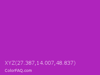 XYZ 27.387,14.007,48.837 Color is a normal magenta color and the nearest color is Dark Orchid #9932cc. Hex code #af24bc and RGB value is rgb(175,36,188). In RGB color space, this color is composed of 69% red, 14% green, 74% blue, In CMYK color space, this color is composed of 7% cyan, 81% magenta, 0% yellow , 26% black , In HSL color space, this color has a hue angle of 295° , 68% saturation and 44% lightness.