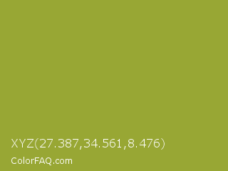 XYZ 27.387,34.561,8.476 Color is a normal yellow color and the nearest color is Sushi #87ab39. Hex code #98a734 and RGB value is rgb(152,167,52). In RGB color space, this color is composed of 60% red, 65% green, 20% blue, In CMYK color space, this color is composed of 9% cyan, 0% magenta, 69% yellow , 35% black , In HSL color space, this color has a hue angle of 68° , 53% saturation and 43% lightness.