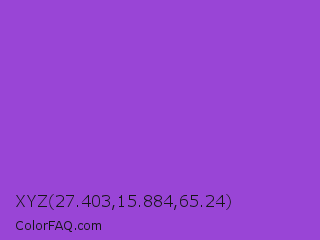 XYZ 27.403,15.884,65.24 Color is a normal purple color and the nearest color is Dark Orchid #9932cc. Hex code #9945d6 and RGB value is rgb(153,69,214). In RGB color space, this color is composed of 60% red, 27% green, 84% blue, In CMYK color space, this color is composed of 29% cyan, 68% magenta, 0% yellow , 16% black , In HSL color space, this color has a hue angle of 275° , 64% saturation and 55% lightness.