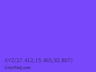 XYZ 27.412,15.465,92.807 Color is a light indigo color and the nearest color is Medium Slate Blue #7b68ee. Hex code #7847fb and RGB value is rgb(120,71,251). In RGB color space, this color is composed of 47% red, 28% green, 98% blue, In CMYK color space, this color is composed of 52% cyan, 72% magenta, 0% yellow , 2% black , In HSL color space, this color has a hue angle of 256° , 96% saturation and 63% lightness.