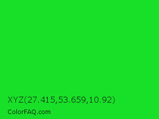 XYZ 27.415,53.659,10.92 Color is a normal green color and the nearest color is Vivid Malachite #00cc33. Hex code #18e028 and RGB value is rgb(24,224,40). In RGB color space, this color is composed of 9% red, 88% green, 16% blue, In CMYK color space, this color is composed of 89% cyan, 0% magenta, 82% yellow , 12% black , In HSL color space, this color has a hue angle of 125° , 81% saturation and 49% lightness.