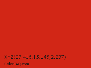 XYZ 27.416,15.146,2.237 Color is a normal red color and the nearest color is Maximum Red #d92121. Hex code #d22616 and RGB value is rgb(210,38,22). In RGB color space, this color is composed of 82% red, 15% green, 9% blue, In CMYK color space, this color is composed of 0% cyan, 82% magenta, 90% yellow , 18% black , In HSL color space, this color has a hue angle of 5° , 81% saturation and 45% lightness.