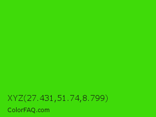 XYZ 27.431,51.74,8.799 Color is a normal green color and the nearest color is Harlequin Green #46cb18. Hex code #3fdb09 and RGB value is rgb(63,219,9). In RGB color space, this color is composed of 25% red, 86% green, 4% blue, In CMYK color space, this color is composed of 71% cyan, 0% magenta, 96% yellow , 14% black , In HSL color space, this color has a hue angle of 105° , 92% saturation and 45% lightness.