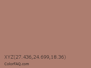 XYZ 27.436,24.699,18.36 Color is a normal red color and the nearest color is Burnished Brown #a17a74. Hex code #ad7d6f and RGB value is rgb(173,125,111). In RGB color space, this color is composed of 68% red, 49% green, 44% blue, In CMYK color space, this color is composed of 0% cyan, 28% magenta, 36% yellow , 32% black , In HSL color space, this color has a hue angle of 14° , 27% saturation and 56% lightness.
