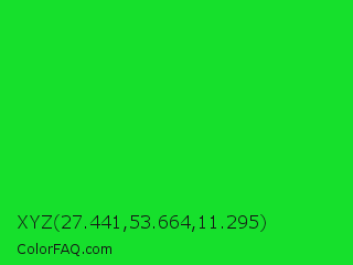 XYZ 27.441,53.664,11.295 Color is a normal green color and the nearest color is Vivid Malachite #00cc33. Hex code #16e02c and RGB value is rgb(22,224,44). In RGB color space, this color is composed of 9% red, 88% green, 17% blue, In CMYK color space, this color is composed of 90% cyan, 0% magenta, 80% yellow , 12% black , In HSL color space, this color has a hue angle of 127° , 82% saturation and 48% lightness.