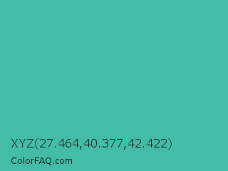 XYZ 27.464,40.377,42.422 Color is a normal cyan color and the nearest color is Puerto Rico #3fc1aa. Hex code #44bda6 and RGB value is rgb(68,189,166). In RGB color space, this color is composed of 27% red, 74% green, 65% blue, In CMYK color space, this color is composed of 64% cyan, 0% magenta, 12% yellow , 26% black , In HSL color space, this color has a hue angle of 169° , 48% saturation and 50% lightness.