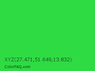 XYZ 27.471,51.649,13.832 Color is a normal green color and the nearest color is Lime Green #32cd32. Hex code #2edb43 and RGB value is rgb(46,219,67). In RGB color space, this color is composed of 18% red, 86% green, 26% blue, In CMYK color space, this color is composed of 79% cyan, 0% magenta, 69% yellow , 14% black , In HSL color space, this color has a hue angle of 127° , 71% saturation and 52% lightness.