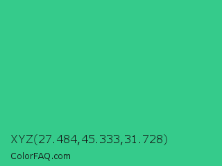 XYZ 27.484,45.333,31.728 Color is a normal green color and the nearest color is Shamrock #33cc99. Hex code #35cb8b and RGB value is rgb(53,203,139). In RGB color space, this color is composed of 21% red, 80% green, 55% blue, In CMYK color space, this color is composed of 74% cyan, 0% magenta, 32% yellow , 20% black , In HSL color space, this color has a hue angle of 154° , 59% saturation and 50% lightness.