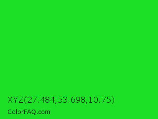 XYZ 27.484,53.698,10.75 Color is a normal green color and the nearest color is Lime Green #32cd32. Hex code #1ce026 and RGB value is rgb(28,224,38). In RGB color space, this color is composed of 11% red, 88% green, 15% blue, In CMYK color space, this color is composed of 88% cyan, 0% magenta, 83% yellow , 12% black , In HSL color space, this color has a hue angle of 123° , 78% saturation and 49% lightness.
