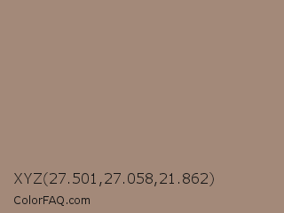 XYZ 27.501,27.058,21.862 Color is a normal orange color and the nearest color is Pharlap #a3807b. Hex code #a38979 and RGB value is rgb(163,137,121). In RGB color space, this color is composed of 64% red, 54% green, 47% blue, In CMYK color space, this color is composed of 0% cyan, 16% magenta, 26% yellow , 36% black , In HSL color space, this color has a hue angle of 23° , 19% saturation and 56% lightness.
