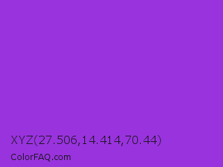 XYZ 27.506,14.414,70.44 Color is a normal purple color and the nearest color is Blue Violet #8a2be2. Hex code #9933de and RGB value is rgb(153,51,222). In RGB color space, this color is composed of 60% red, 20% green, 87% blue, In CMYK color space, this color is composed of 31% cyan, 77% magenta, 0% yellow , 13% black , In HSL color space, this color has a hue angle of 276° , 72% saturation and 54% lightness.