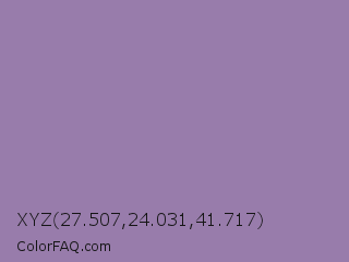 XYZ 27.507,24.031,41.717 Color is a normal purple color and the nearest color is Lavender Purple #967bb6. Hex code #987cab and RGB value is rgb(152,124,171). In RGB color space, this color is composed of 60% red, 49% green, 67% blue, In CMYK color space, this color is composed of 11% cyan, 27% magenta, 0% yellow , 33% black , In HSL color space, this color has a hue angle of 276° , 22% saturation and 58% lightness.