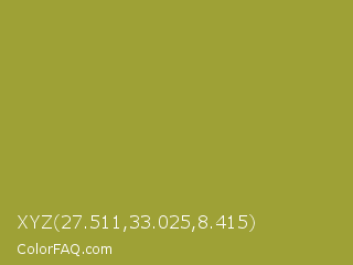 XYZ 27.511,33.025,8.415 Color is a normal yellow color and the nearest color is Citron #9fa91f. Hex code #9ea136 and RGB value is rgb(158,161,54). In RGB color space, this color is composed of 62% red, 63% green, 21% blue, In CMYK color space, this color is composed of 2% cyan, 0% magenta, 66% yellow , 37% black , In HSL color space, this color has a hue angle of 62° , 50% saturation and 42% lightness.