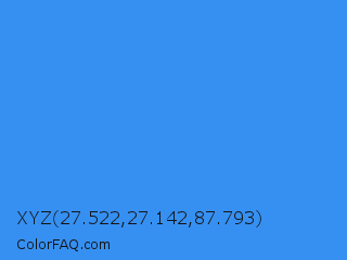 XYZ 27.522,27.142,87.793 Color is a normal blue color and the nearest color is Bleu De France #318ce7. Hex code #3690f2 and RGB value is rgb(54,144,242). In RGB color space, this color is composed of 21% red, 56% green, 95% blue, In CMYK color space, this color is composed of 78% cyan, 40% magenta, 0% yellow , 5% black , In HSL color space, this color has a hue angle of 211° , 88% saturation and 58% lightness.
