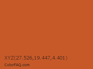 XYZ 27.526,19.447,4.401 Color is a normal orange color and the nearest color is Piper #c96323. Hex code #c75929 and RGB value is rgb(199,89,41). In RGB color space, this color is composed of 78% red, 35% green, 16% blue, In CMYK color space, this color is composed of 0% cyan, 55% magenta, 79% yellow , 22% black , In HSL color space, this color has a hue angle of 18° , 66% saturation and 47% lightness.
