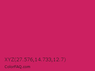 XYZ 27.576,14.733,12.7 Color is a normal rose color and the nearest color is Rose Red #c21e56. Hex code #cc2061 and RGB value is rgb(204,32,97). In RGB color space, this color is composed of 80% red, 13% green, 38% blue, In CMYK color space, this color is composed of 0% cyan, 84% magenta, 52% yellow , 20% black , In HSL color space, this color has a hue angle of 337° , 73% saturation and 46% lightness.