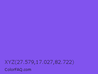 XYZ 27.579,17.027,82.722 Color is a light indigo color and the nearest color is Navy Purple #9457eb. Hex code #8153ee and RGB value is rgb(129,83,238). In RGB color space, this color is composed of 51% red, 33% green, 93% blue, In CMYK color space, this color is composed of 46% cyan, 65% magenta, 0% yellow , 7% black , In HSL color space, this color has a hue angle of 258° , 82% saturation and 63% lightness.