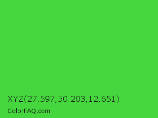 XYZ 27.597,50.203,12.651 Color is a normal green color and the nearest color is Lime Green #32cd32. Hex code #45d73d and RGB value is rgb(69,215,61). In RGB color space, this color is composed of 27% red, 84% green, 24% blue, In CMYK color space, this color is composed of 68% cyan, 0% magenta, 72% yellow , 16% black , In HSL color space, this color has a hue angle of 117° , 66% saturation and 54% lightness.