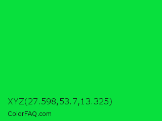 XYZ 27.598,53.7,13.325 Color is a normal green color and the nearest color is Malachite #0bda51. Hex code #08e03d and RGB value is rgb(8,224,61). In RGB color space, this color is composed of 3% red, 88% green, 24% blue, In CMYK color space, this color is composed of 96% cyan, 0% magenta, 73% yellow , 12% black , In HSL color space, this color has a hue angle of 135° , 93% saturation and 45% lightness.