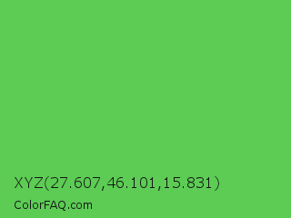 XYZ 27.607,46.101,15.831 Color is a normal green color and the nearest color is Mantis #74c365. Hex code #5ccc54 and RGB value is rgb(92,204,84). In RGB color space, this color is composed of 36% red, 80% green, 33% blue, In CMYK color space, this color is composed of 55% cyan, 0% magenta, 59% yellow , 20% black , In HSL color space, this color has a hue angle of 116° , 54% saturation and 56% lightness.