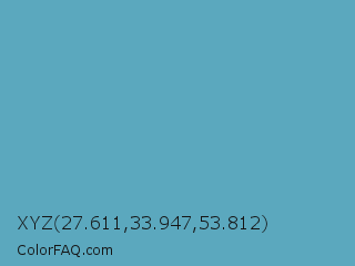 XYZ 27.611,33.947,53.812 Color is a normal cyan color and the nearest color is Fountain Blue #56b4be. Hex code #5ba8be and RGB value is rgb(91,168,190). In RGB color space, this color is composed of 36% red, 66% green, 75% blue, In CMYK color space, this color is composed of 52% cyan, 12% magenta, 0% yellow , 25% black , In HSL color space, this color has a hue angle of 193° , 43% saturation and 55% lightness.