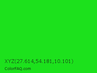 XYZ 27.614,54.181,10.101 Color is a normal green color and the nearest color is Lime Green #32cd32. Hex code #1ce11c and RGB value is rgb(28,225,28). In RGB color space, this color is composed of 11% red, 88% green, 11% blue, In CMYK color space, this color is composed of 88% cyan, 0% magenta, 88% yellow , 12% black , In HSL color space, this color has a hue angle of 120° , 78% saturation and 50% lightness.