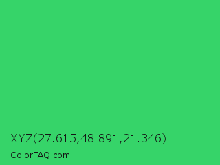 XYZ 27.615,48.891,21.346 Color is a normal green color and the nearest color is UFO Green #3cd070. Hex code #36d469 and RGB value is rgb(54,212,105). In RGB color space, this color is composed of 21% red, 83% green, 41% blue, In CMYK color space, this color is composed of 75% cyan, 0% magenta, 50% yellow , 17% black , In HSL color space, this color has a hue angle of 139° , 65% saturation and 52% lightness.