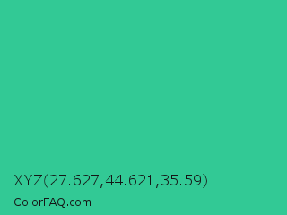 XYZ 27.627,44.621,35.59 Color is a normal green color and the nearest color is Shamrock #33cc99. Hex code #32c995 and RGB value is rgb(50,201,149). In RGB color space, this color is composed of 20% red, 79% green, 58% blue, In CMYK color space, this color is composed of 75% cyan, 0% magenta, 26% yellow , 21% black , In HSL color space, this color has a hue angle of 159° , 60% saturation and 49% lightness.