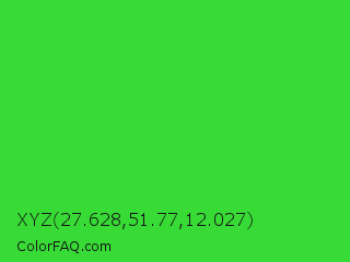 XYZ 27.628,51.77,12.027 Color is a normal green color and the nearest color is Lime Green #32cd32. Hex code #38db36 and RGB value is rgb(56,219,54). In RGB color space, this color is composed of 22% red, 86% green, 21% blue, In CMYK color space, this color is composed of 74% cyan, 0% magenta, 75% yellow , 14% black , In HSL color space, this color has a hue angle of 119° , 70% saturation and 54% lightness.