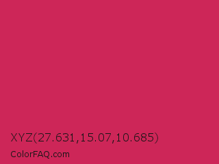 XYZ 27.631,15.07,10.685 Color is a normal rose color and the nearest color is Rose Red #c21e56. Hex code #cd2658 and RGB value is rgb(205,38,88). In RGB color space, this color is composed of 80% red, 15% green, 35% blue, In CMYK color space, this color is composed of 0% cyan, 81% magenta, 57% yellow , 20% black , In HSL color space, this color has a hue angle of 342° , 69% saturation and 48% lightness.