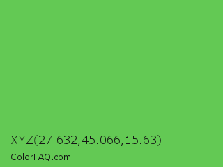 XYZ 27.632,45.066,15.63 Color is a normal green color and the nearest color is Mantis #74c365. Hex code #63c954 and RGB value is rgb(99,201,84). In RGB color space, this color is composed of 39% red, 79% green, 33% blue, In CMYK color space, this color is composed of 51% cyan, 0% magenta, 58% yellow , 21% black , In HSL color space, this color has a hue angle of 112° , 52% saturation and 56% lightness.