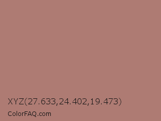 XYZ 27.633,24.402,19.473 Color is a normal red color and the nearest color is Burnished Brown #a17a74. Hex code #ae7b73 and RGB value is rgb(174,123,115). In RGB color space, this color is composed of 68% red, 48% green, 45% blue, In CMYK color space, this color is composed of 0% cyan, 29% magenta, 34% yellow , 32% black , In HSL color space, this color has a hue angle of 8° , 27% saturation and 57% lightness.