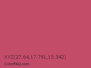 XYZ 27.64,17.791,15.342 Color is a normal red color and the nearest color is Popstar #be4f62. Hex code #c34c69 and RGB value is rgb(195,76,105). In RGB color space, this color is composed of 76% red, 30% green, 41% blue, In CMYK color space, this color is composed of 0% cyan, 61% magenta, 46% yellow , 24% black , In HSL color space, this color has a hue angle of 345° , 50% saturation and 53% lightness.