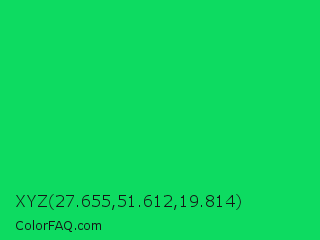 XYZ 27.655,51.612,19.814 Color is a normal green color and the nearest color is Malachite #0bda51. Hex code #0ddb61 and RGB value is rgb(13,219,97). In RGB color space, this color is composed of 5% red, 86% green, 38% blue, In CMYK color space, this color is composed of 94% cyan, 0% magenta, 56% yellow , 14% black , In HSL color space, this color has a hue angle of 144° , 89% saturation and 45% lightness.