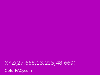 XYZ 27.668,13.215,48.669 Color is a normal magenta color and the nearest color is Heliotrope Magenta #aa00bb. Hex code #b300bc and RGB value is rgb(179,0,188). In RGB color space, this color is composed of 70% red, 0% green, 74% blue, In CMYK color space, this color is composed of 5% cyan, 100% magenta, 0% yellow , 26% black , In HSL color space, this color has a hue angle of 297° , 100% saturation and 37% lightness.