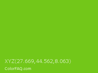 XYZ 27.669,44.562,8.063 Color is a normal green color and the nearest color is Lima #76bd17. Hex code #73c719 and RGB value is rgb(115,199,25). In RGB color space, this color is composed of 45% red, 78% green, 10% blue, In CMYK color space, this color is composed of 42% cyan, 0% magenta, 87% yellow , 22% black , In HSL color space, this color has a hue angle of 89° , 78% saturation and 44% lightness.