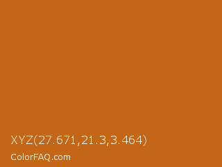XYZ 27.671,21.3,3.464 Color is a normal orange color and the nearest color is Alloy Orange #c46210. Hex code #c46617 and RGB value is rgb(196,102,23). In RGB color space, this color is composed of 77% red, 40% green, 9% blue, In CMYK color space, this color is composed of 0% cyan, 48% magenta, 88% yellow , 23% black , In HSL color space, this color has a hue angle of 27° , 79% saturation and 43% lightness.