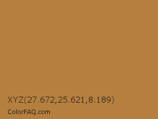 XYZ 27.672,25.621,8.189 Color is a normal orange color and the nearest color is Copper #b87333. Hex code #b5803f and RGB value is rgb(181,128,63). In RGB color space, this color is composed of 71% red, 50% green, 25% blue, In CMYK color space, this color is composed of 0% cyan, 29% magenta, 65% yellow , 29% black , In HSL color space, this color has a hue angle of 33° , 48% saturation and 48% lightness.