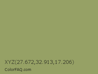 XYZ 27.672,32.913,17.206 Color is a normal lime color and the nearest color is Moss Green #8a9a5b. Hex code #96a165 and RGB value is rgb(150,161,101). In RGB color space, this color is composed of 59% red, 63% green, 40% blue, In CMYK color space, this color is composed of 7% cyan, 0% magenta, 37% yellow , 37% black , In HSL color space, this color has a hue angle of 71° , 24% saturation and 51% lightness.