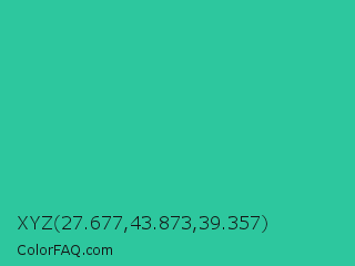 XYZ 27.677,43.873,39.357 Color is a normal cyan color and the nearest color is Shamrock #33cc99. Hex code #2dc79e and RGB value is rgb(45,199,158). In RGB color space, this color is composed of 18% red, 78% green, 62% blue, In CMYK color space, this color is composed of 77% cyan, 0% magenta, 21% yellow , 22% black , In HSL color space, this color has a hue angle of 164° , 63% saturation and 48% lightness.