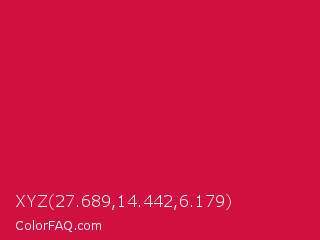 XYZ 27.689,14.442,6.179 Color is a normal red color and the nearest color is Crimson #dc143c. Hex code #d21040 and RGB value is rgb(210,16,64). In RGB color space, this color is composed of 82% red, 6% green, 25% blue, In CMYK color space, this color is composed of 0% cyan, 92% magenta, 70% yellow , 18% black , In HSL color space, this color has a hue angle of 345° , 86% saturation and 44% lightness.
