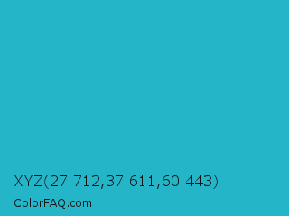 XYZ 27.712,37.611,60.443 Color is a normal cyan color and the nearest color is Ball Blue #21abcd. Hex code #25b5c8 and RGB value is rgb(37,181,200). In RGB color space, this color is composed of 15% red, 71% green, 78% blue, In CMYK color space, this color is composed of 82% cyan, 10% magenta, 0% yellow , 22% black , In HSL color space, this color has a hue angle of 187° , 69% saturation and 46% lightness.
