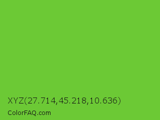 XYZ 27.714,45.218,10.636 Color is a normal green color and the nearest color is Green RYB #66b032. Hex code #6cc935 and RGB value is rgb(108,201,53). In RGB color space, this color is composed of 42% red, 79% green, 21% blue, In CMYK color space, this color is composed of 46% cyan, 0% magenta, 74% yellow , 21% black , In HSL color space, this color has a hue angle of 98° , 58% saturation and 50% lightness.